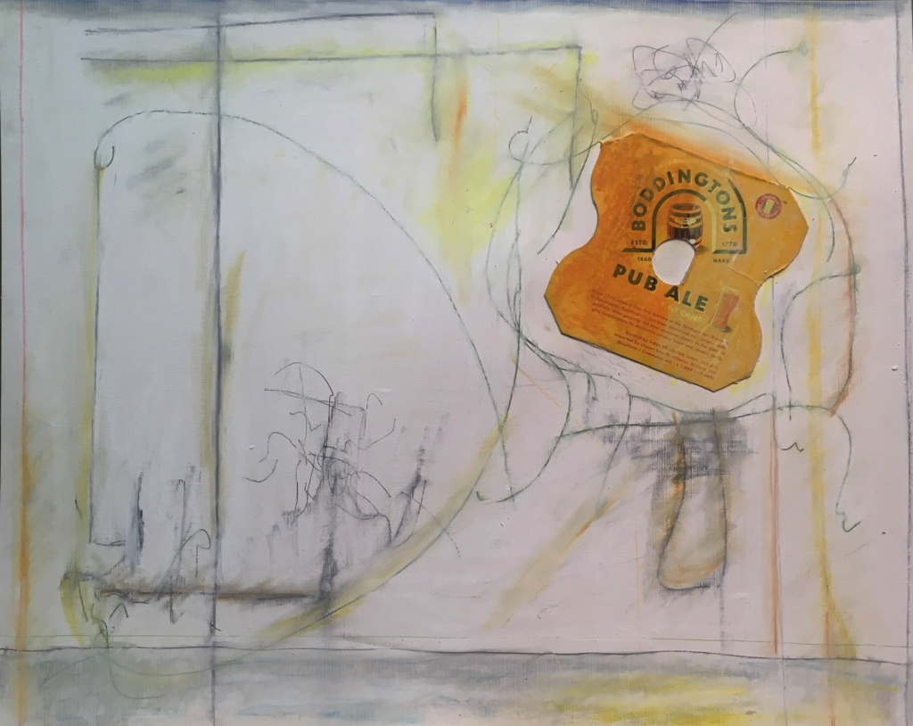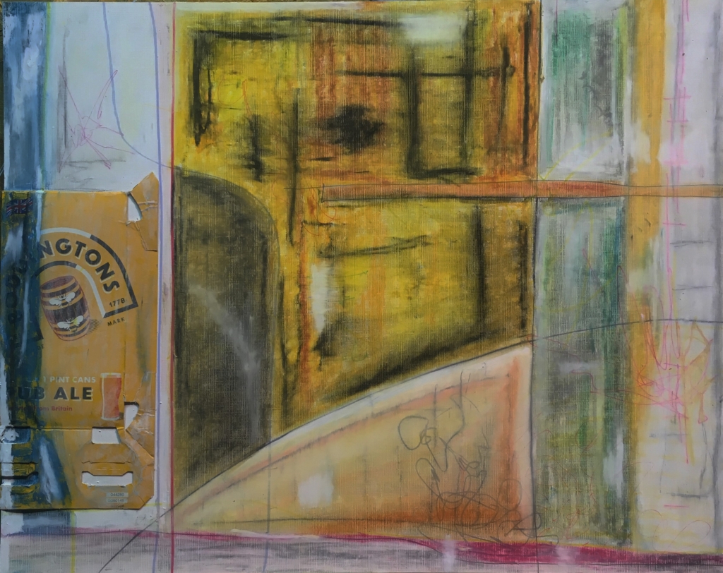Stephen Reichert, Untitled, 2016. Oil pastel, charcoal, Boddingtons four pack box on wood pulp paper, 16" x 20".